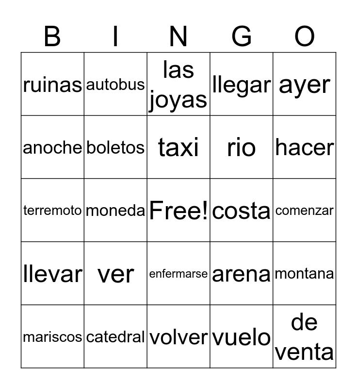 This bingo card has a free space and 24 words: ver, catedral, taxi, mariscos, ayer, ruinas, anoche, autobus, costa, enfermarse, rio, terremoto, arena, montana, boletos, vuelo, comenzar, las joyas, hacer, moneda, de venta, llevar, llegar and volver.
