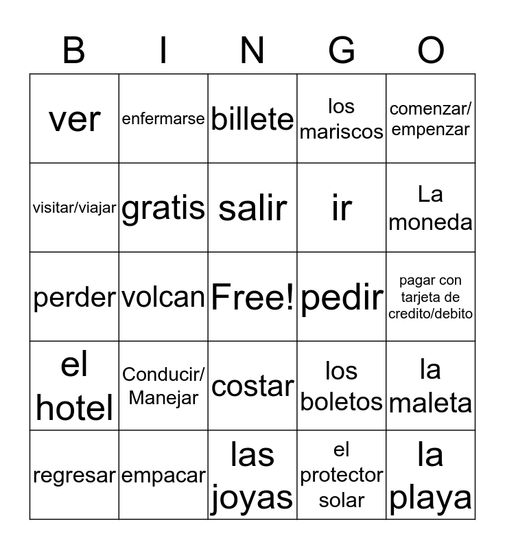 This bingo card has a free space and 24 words: Conducir/ Manejar, empacar, salir, regresar, comenzar/ empenzar, ver, visitar/viajar, enfermarse, pedir, costar, ir, perder, los boletos, la maleta, gratis, el protector solar, pagar con tarjeta de credito/debito, billete, La moneda, volcan, la playa, el hotel, los mariscos and las joyas.