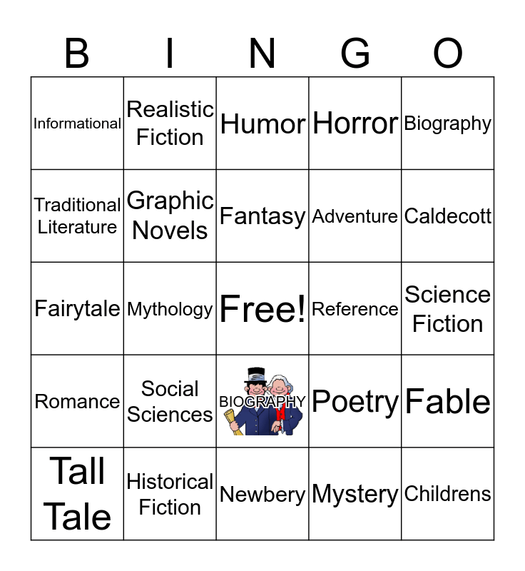 This bingo card has 1 images, a free space and 26 words: BIOGRAPHY, Mystery, Fantasy, Historical Fiction, Biography, Informational, Traditional Literature, Realistic Fiction, Science Fiction, Poetry, Adventure, Fairytale, Fable, Tall Tale, Mythology, Dystopian, Horror, Romance, Humor, Childrens, Caldecott, Newbery, Reference, Social Sciences, Graphic Novels and How To's.