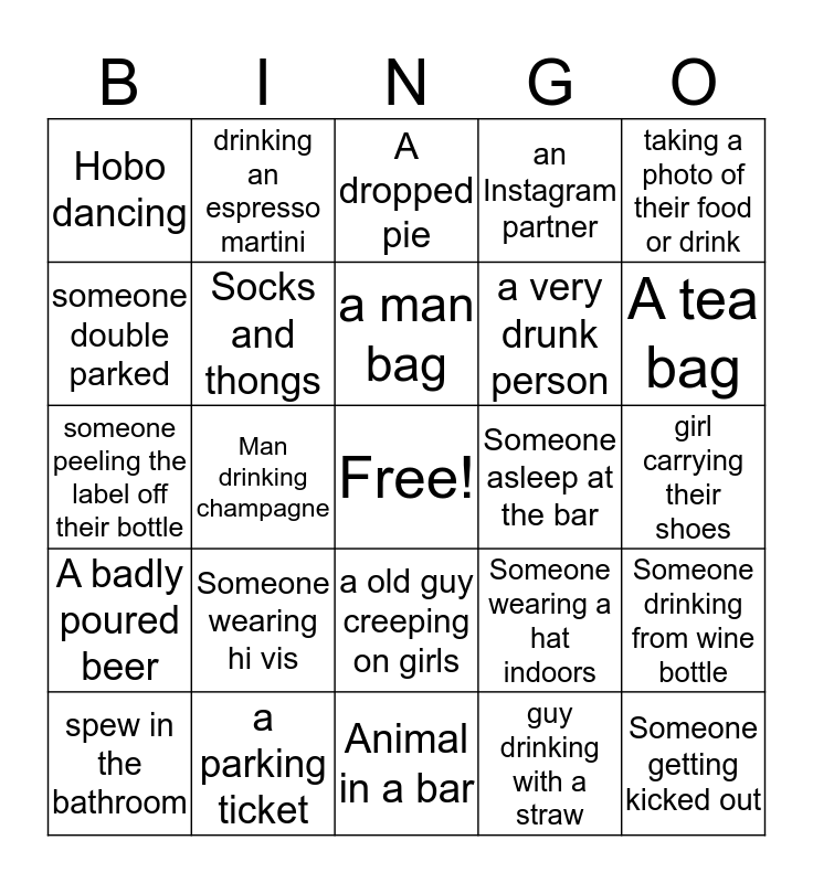 This bingo card has a free space and 31 words: Animal in a bar, Bucks/hens party, Man drinking champagne, Woman drinking a dark beer, Hobo dancing, A dropped pie, Socks and thongs, Someone wearing a hat indoors, Someone asleep at the bar, guy drinking with a straw, girl carrying their shoes, Someone getting kicked out, Dayn hitting on a bar tender, Dayn falling over himself, A tea bag, You buying Dayn a drink, Someone drinking from wine bottle, Someone wearing hi vis, A badly poured beer, a old guy creeping on girls, taking a photo of their food or drink, someone doing a shot, spew in the bathroom, drinking an espresso martini, a very drunk person, someone double parked, an Instagram partner, someone peeling the label off their bottle, a parking ticket, a man bag and Crocs.