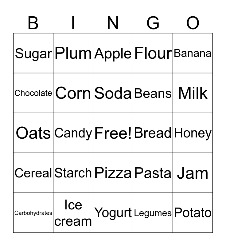 This bingo card has a free space and 29 words: Carbohydrates, Rice, Candy, Cake, Sugar, Apple, Corn, Starch, Bread, Ice cream, Honey, Potato, Yogurt, Legumes, Milk, Chips, Pizza, Cereal, Banana, Oats, Pasta, Coke, Beans, Chocolate, Flour, Plum, Jam, Soda and Beets.
