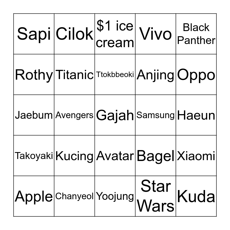 This bingo card has 25 words: Kucing, Yoojung, Ttokbbeoki, Apple, Black Panther, Sapi, Rothy, Cilok, Samsung, Avatar, Anjing, Jaebum, Bagel, Xiaomi, Titanic, Kuda, Haeun, $1 ice cream, Oppo, Avengers, Gajah, Chanyeol, Takoyaki, Vivo and Star Wars.