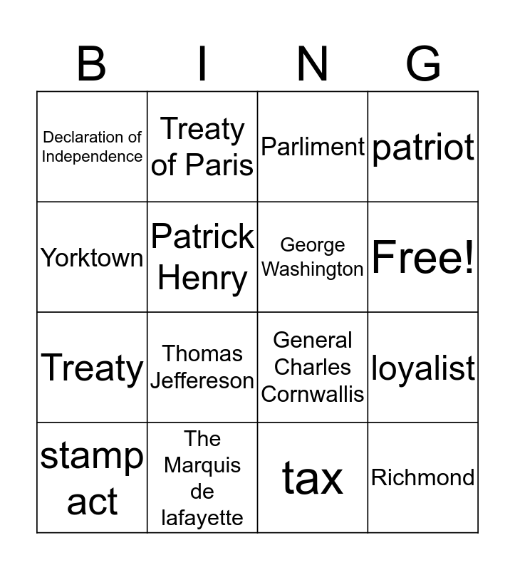 This bingo card has 17 words: tax, stamp act, Parliment, Declaration of Independence, Thomas Jeffereson, patriot, loyalist, George Washington, Free!, Patrick Henry, The Marquis de lafayette, General Charles Cornwallis, Yorktown, Treaty of Paris, Treaty, Williamsburg and Richmond.