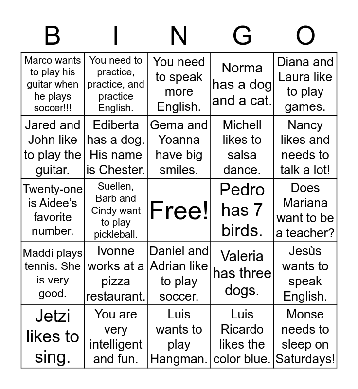 This bingo card has a free space and 24 words: Ivonne works at a pizza restaurant., You are very intelligent and fun., Gema and Yoanna have big smiles., Jetzi likes to sing., Diana and Laura like to play games., Marco wants to play his guitar when he plays soccer!!!, Jared and John like to play the guitar., You need to practice, practice, and practice English., Pedro has 7 birds., Daniel and Adrian like to play soccer., Michell likes to salsa dance., Twenty-one is Aidee’s favorite number., Valeria has three dogs., Jesùs wants to speak English., Ediberta has a dog. His name is Chester., Luis Ricardo likes the color blue., Does Mariana want to be a teacher?, You need to speak more English., Nancy likes and needs to talk a lot!, Suellen, Barb and Cindy want to play pickleball., Monse needs to sleep on Saturdays!, Maddi plays tennis. She is very good., Norma has a dog and a cat. and Luis wants to play Hangman..