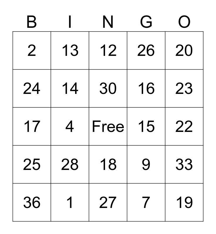 This bingo card has a free space and 30 words: 1, 10, 4, 3, 2, 12, 14, 18, 15, 27, 22, 19, 7, 35, 23, 21, 9, 25, 28, 20, 17, 11, 13, 16, 24, 26, 33, 36, 30 and 39.