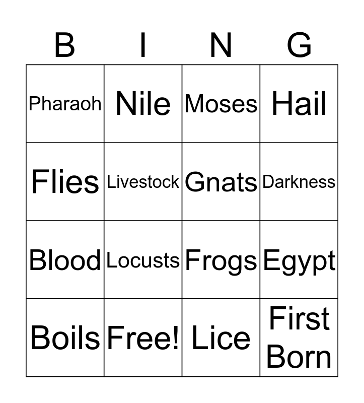 This bingo card has 16 words: Free!, Egypt, Moses, Pharaoh, Blood, Nile, Frogs, Lice, Flies, Livestock, Boils, Hail, Locusts, Darkness, Gnats and First Born.