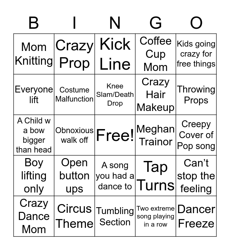 This bingo card has a free space and 28 words: Can’t stop the feeling, Billie Eilsh Song, Crazy Hair Makeup, Two extreme song playing in a row, Everyone lift, Kick Line, Crazy Prop, Boy lifting only, Meghan Trainor, Crazy Dance Mom, A Child w a bow bigger than head, Coffee Cup Mom, Circus Theme, Tumbling Section, Throwing Props, Fouette section, Open button ups, Costume Malfunction, Knee Slam/Death Drop, A song you had a dance to, Mom Knitting, Only one name called, Dancer Freeze, Obnoxious walk off, Creepy Cover of Pop song, Tap Turns, Kids going crazy for free things and Kids that don’t know teacher name.