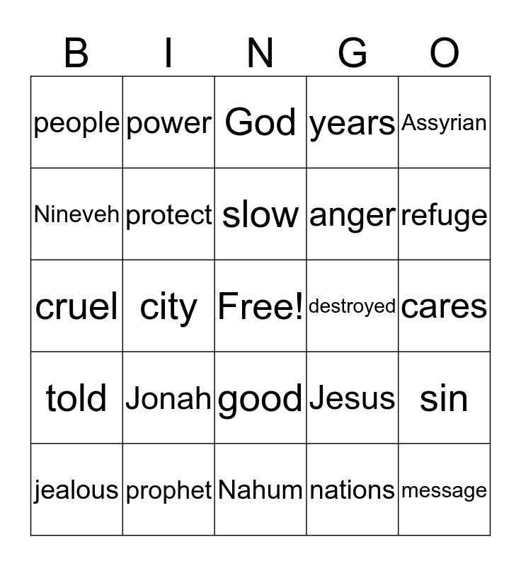 This bingo card has a free space and 24 words: Jonah, prophet, slow, jealous, Assyrian, people, Nineveh, power, destroyed, good, anger, cruel, Jesus, sin, protect, nations, cares, God, refuge, city, message, told, years and Nahum.