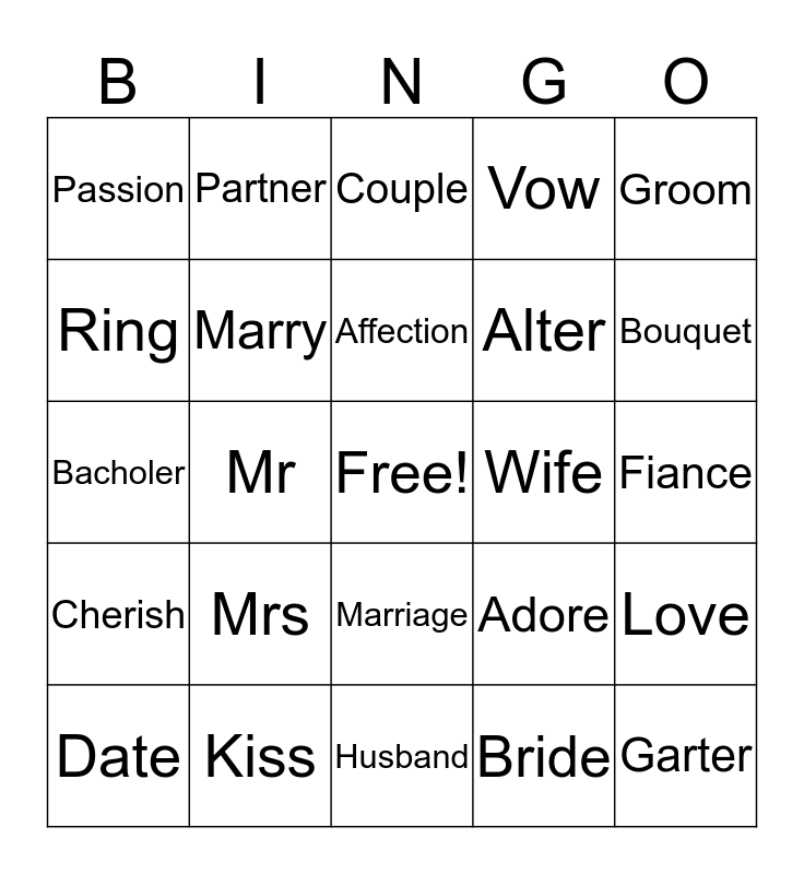 This bingo card has a free space and 24 words: Mrs, Kiss, Affection, Date, Groom, Passion, Ring, Partner, Wife, Marriage, Alter, Bacholer, Adore, Love, Marry, Bride, Fiance, Couple, Bouquet, Mr, Garter, Cherish, Vow and Husband.