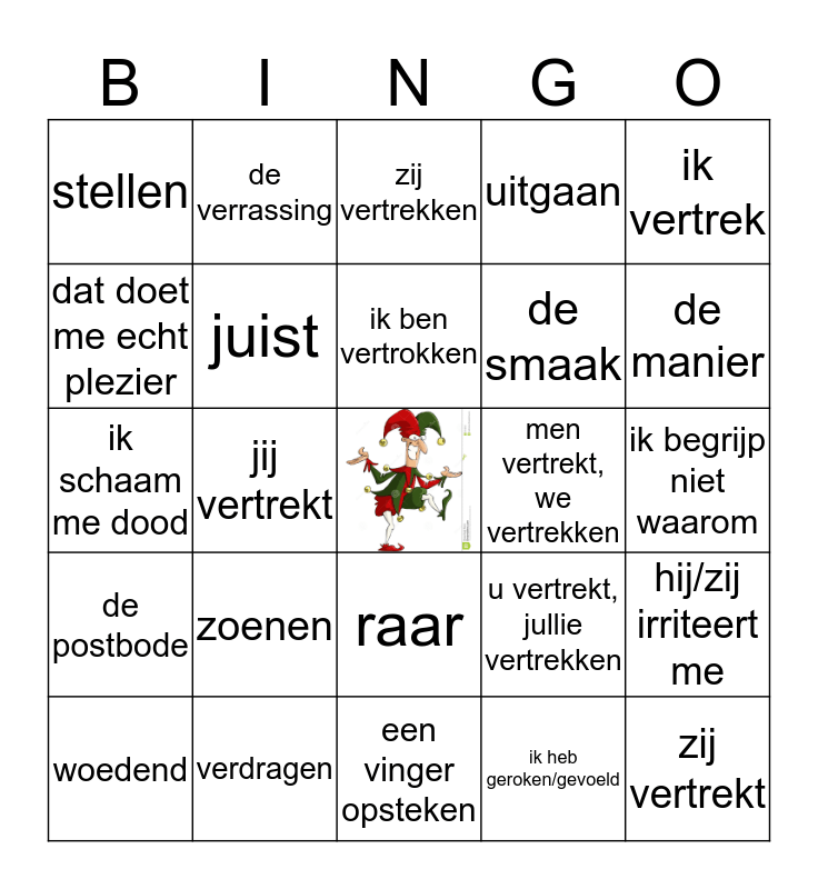 This bingo card has a free space and 55 words: vertrekken, woedend, boos, stellen, een vinger opsteken, de vinger, juist, gekleed, de smaak, slank, uitgaan, jaloers, onzin!, mijn vader gaat ver weg, zij gaat uit met een jongen, dat ruikt lekker, ik vertrek, jij vertrekt, hij vertrekt, zij vertrekt, men vertrekt, we vertrekken, wij vertrekken, u vertrekt, jullie vertrekken, zij vertrekken, zij vertrekken, ik ben vertrokken, ik heb geroken/gevoeld, ik ben woedend, ik begrijp niet waarom, hij/zij irriteert me, ze probeert altijd in de smaak te vallen bij de leraren, je bent gewoon jaloers, dat is ontzettend aardig, ik ben erg blij, dat doet me echt plezier, ik schaam me dood, ik verdraag het niet, de postbode, het pakje, maak open, de verrassing, ik lees, zich schamen voor, brengen, wegbrengen, zoenen, verdragen, sluiten, de deur, de sleutel, de manier, zich kleden, ouderwets, stom, stom, raar and bekritiseren.