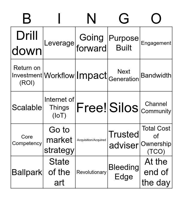 This bingo card has a free space and 43 words: Artificial Intelligence (AI), Internet of Things (IoT), Blockchain, Big Data, Machine Learning, Ballpark, Leverage, Strategic, Next Generation, Total Cost of Ownership (TCO), Return on Investment (ROI), Go to market strategy, Revolutionary, Bleeding Edge, Outside the Box, Core Competency, Deep Dive, Impact, Move the needle, Bandwidth, Drill down, Wheelhouse, Acquisition/Acquired, Purpose Built, Flexible, Scalable, Available, Smart, Big Picture, Channel Community, Win-Win, State of the art, Trending, Trusted adviser, At the end of the day, Platform, X as a service, Going forward, Silos, Engagement, Customer-Centric, Workflow and Hustle.