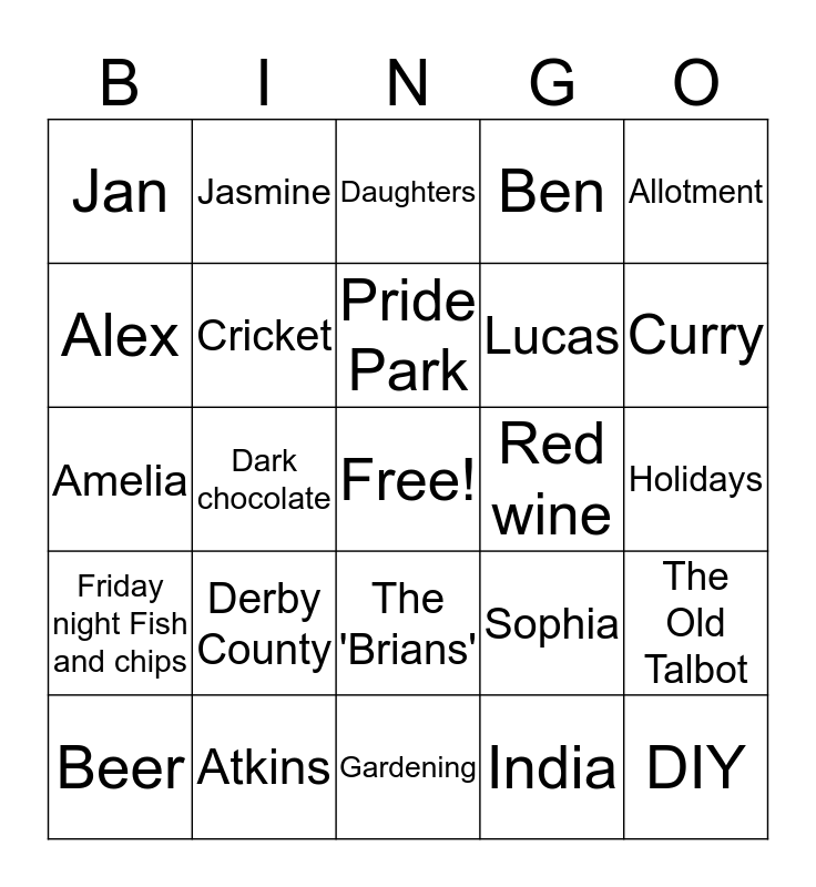 This bingo card has a free space and 29 words: Beer, King's Head, Dark chocolate, British Rail, Jan, Daughters, Cricket, Derby County, Red wine, Atkins, Holidays, DIY, Gardening, India, Curry, Liquorice allsorts, The 'Brians', Friday night Fish and chips, Allotment, Amelia, Sophia, Marcus, Lucas, Alex, Ben, Jasmine, The Old Talbot, Pride Park and Golf.