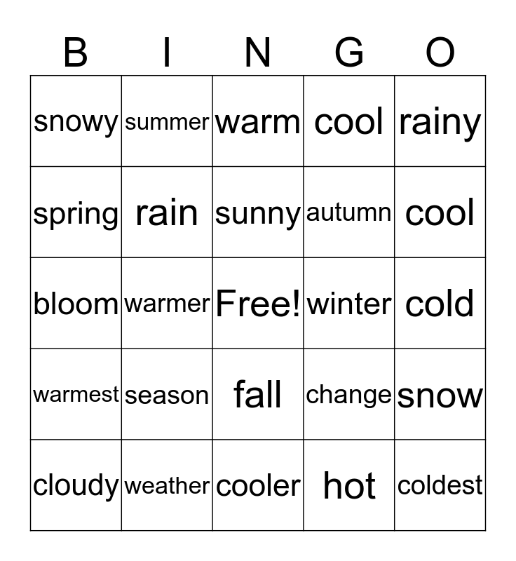 This bingo card has a free space and 24 words: season, weather, sunny, cloudy, rainy, snowy, spring, summer, winter, fall, autumn, bloom, change, snow, rain, hot, cold, warm, cool, warmer, coldest, warmest, cool and cooler.