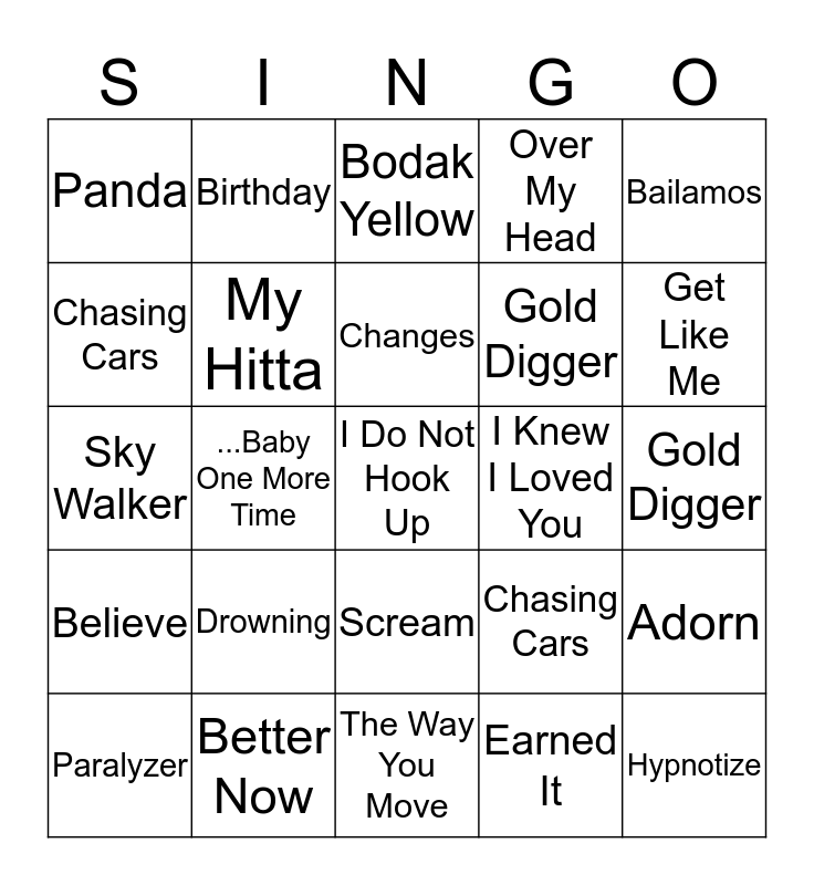 This bingo card has 25 words: Drowning, The Way You Move, Changes, Paralyzer, Bailamos, Panda, Chasing Cars, Birthday, I Knew I Loved You, Scream, Gold Digger, Sky Walker, Chasing Cars, Adorn, My Hitta, Hypnotize, Gold Digger, Bodak Yellow, Get Like Me, ...Baby One More Time, I Do Not Hook Up, Better Now, Believe, Over My Head and Earned It.