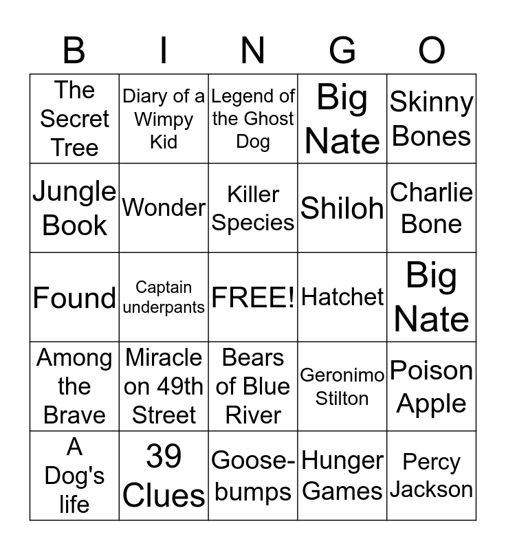 This bingo card has a free space and 31 words: Goose-bumps, Harry Potter, Captain underpants, Dork Diaries, The Secret Tree, Legend of the Ghost Dog, Wonder, Geronimo Stilton, Hatchet, Hunger Games, Big Nate, Percy Jackson, Narnia, Midnight Library, Charlie Bone, Million $ Throw, Poison Apple, Miracle on 49th Street, Among the Brave, Bears of Blue River, Skinny Bones, Savvy, A Dog's life, Diary of a Wimpy Kid, Shiloh, Jungle Book, Big Nate, Found, 39 Clues, Killer Species and Lunch Lady.
