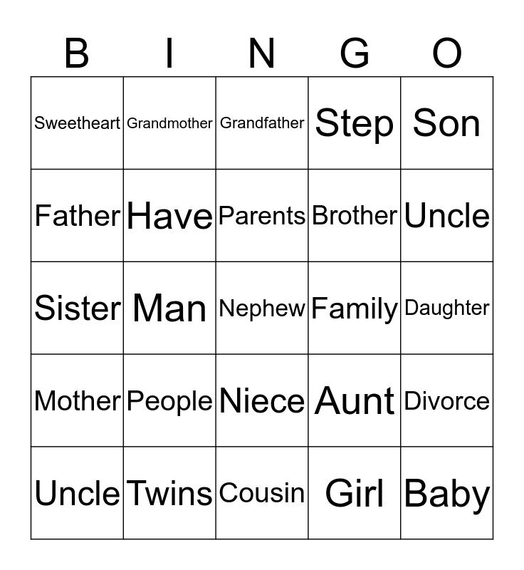 This bingo card has 27 words: Aunt, Baby, Brother, Cousin, Father, Grandfather, Grandmother, Mother, Family, Divorce, Sister, Step, Uncle, Twins, Uncle, Children, Have, Parents, People, Sweetheart, Daughter, Girl, Man, Nephew, Niece, Son and Woman.