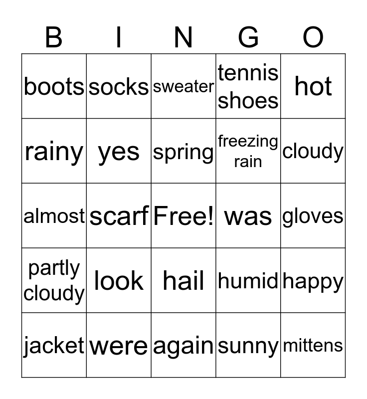 This bingo card has a free space and 29 words: jacket, know, scarf, hat, boots, sweater, yes, look, was, were, gloves, mittens, again, sunny, cloudy, windy, hail, partly cloudy, hot, almost, humid, snowy, freezing rain, rainy, tennis shoes, socks, happy, spring and warm.