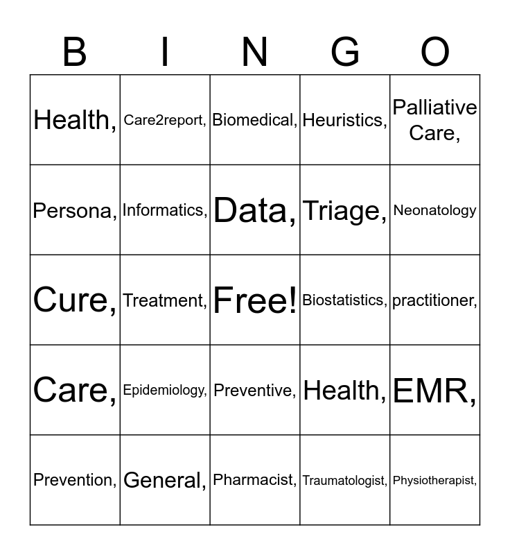 This bingo card has a free space and 29 words: Prevention,, Diagnosis,, Treatment,, Wellness,, Health,, Biomedical,, Informatics,, Epidemiology,, Biostatistics,, General,, practitioner,, Physiotherapist,, Pharmacist,, Traumatologist,, Neonatology, ,Rehabilitation,, Preventive,, Care,, Palliative Care,, Cure,, Health,, Expenditure,, Triage,, Persona,, Heuristics,, Care2report,, EMR,, Data, and Structuring.