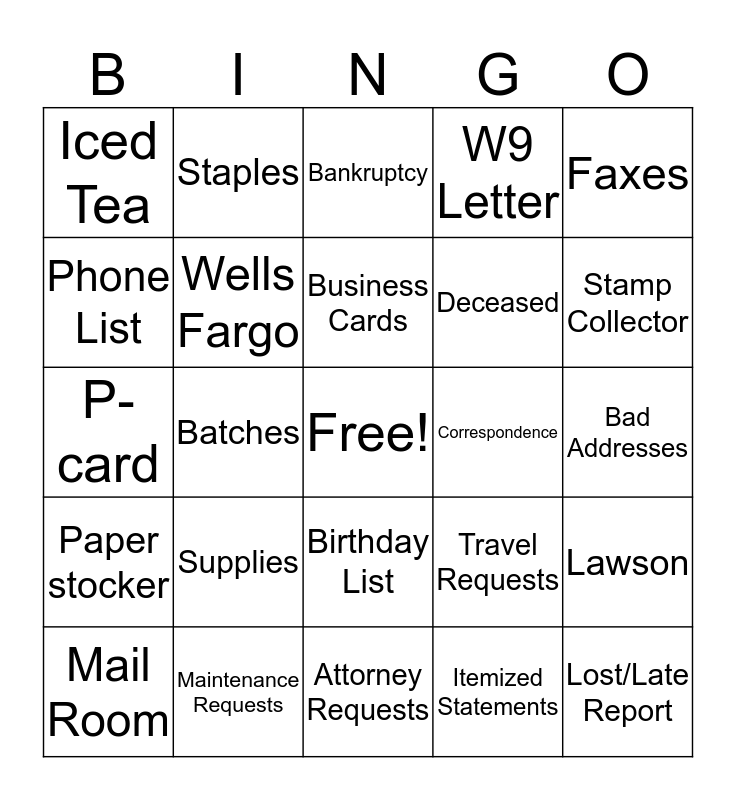 This bingo card has a free space and 29 words: Mail Room, Boxes, Batches, Laminating, Iced Tea, Bankruptcy, Wells Fargo, Supplies, Correspondence, Maintenance Requests, Bad Addresses, Lost/Late Report, Attorney Requests, Itemized Statements, Stamp Collector, ABN's, Birthday List, Paper stocker, Faxes, P-card, Travel Requests, Auditor Requests, Deceased, Phone List, W9 Letter, Staples, Lawson, Business Cards and Keys.