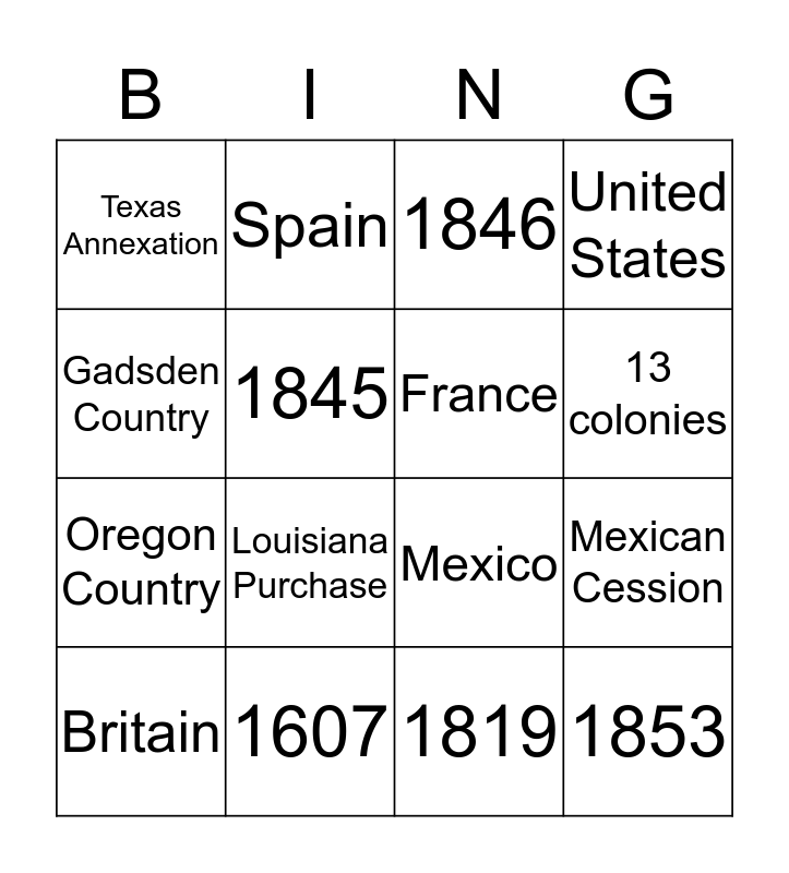 This bingo card has 16 words: 1607, Mexican Cession, 1846, Texas Annexation, Oregon Country, Spain, Mexico, 1819, Gadsden Country, 1845, Britain, United States, Louisiana Purchase, 13 colonies, France and 1853.