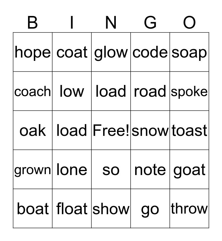 This bingo card has a free space and 24 words: boat, lone, load, go, soap, hope, coat, glow, snow, toast, oak, low, note, goat, coach, float, show, code, spoke, grown, load, so, road and throw.