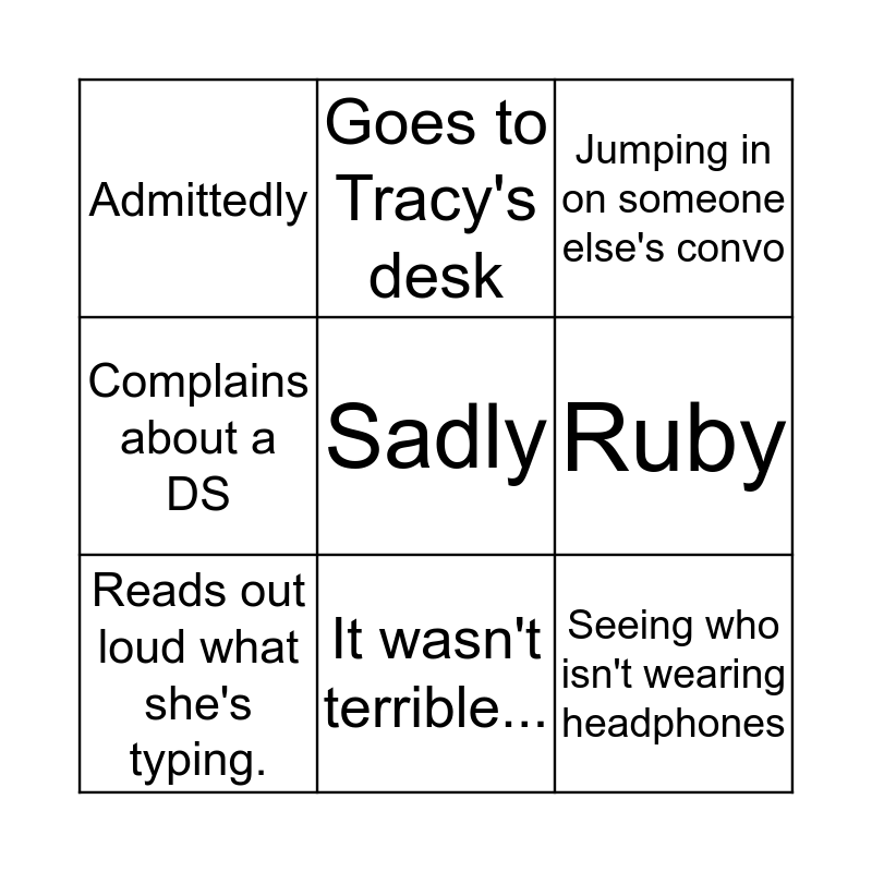 This bingo card has 15 words: I love it when a dealer _____, RAMBLE MODE, Jumping in on someone else's convo, Admittedly, It wasn't terrible..., Sadly, Going to Ryan/Jeremy Desk, ROBOT MODE!, Ruby, Seeing who isn't wearing headphones, Those awkward situations where _____, Complains about a DS, Reads out loud what she's typing., Goes to Tracy's desk and Talks about the weather.