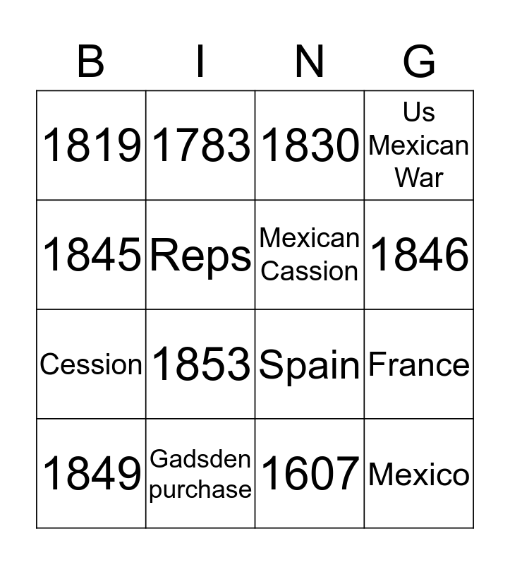 This bingo card has 16 words: Gadsden purchase, France, 1830, 1819, Cession, 1783, Spain, 1607, 1845, Reps, 1849, Us Mexican War, 1853, 1846, Mexican Cassion and Mexico.