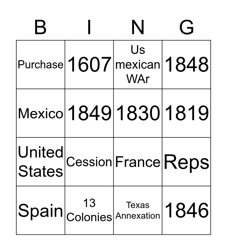 This bingo card has 16 words: 13 Colonies, Reps, Us mexican WAr, Purchase, United States, 1607, France, Texas Annexation, Mexico, 1849, Spain, 1848, Cession, 1819, 1830 and 1846.