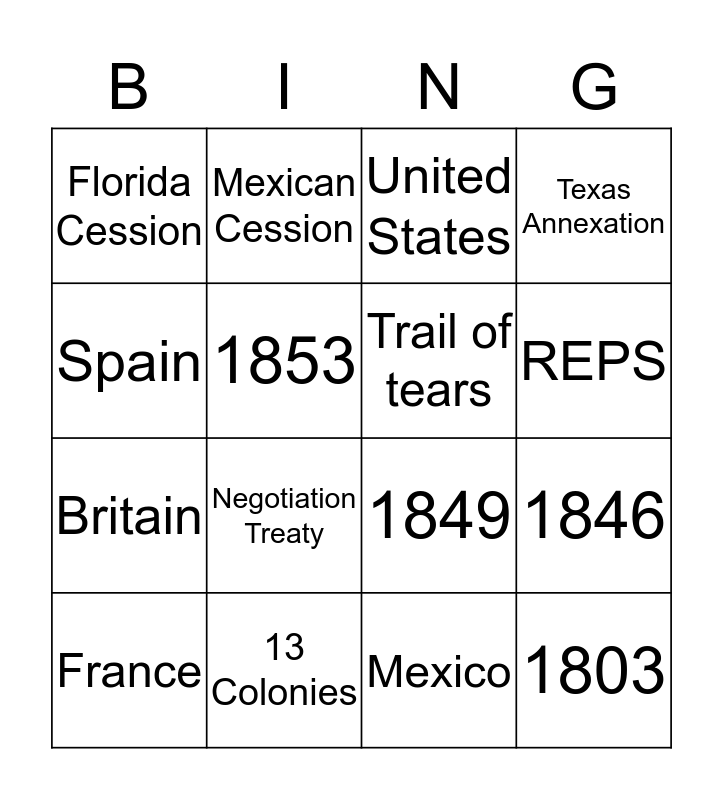 This bingo card has 16 words: 13 Colonies, 1846, United States, Florida Cession, Britain, Mexican Cession, 1849, Mexico, Spain, 1853, France, Texas Annexation, Negotiation Treaty, REPS, Trail of tears and 1803.