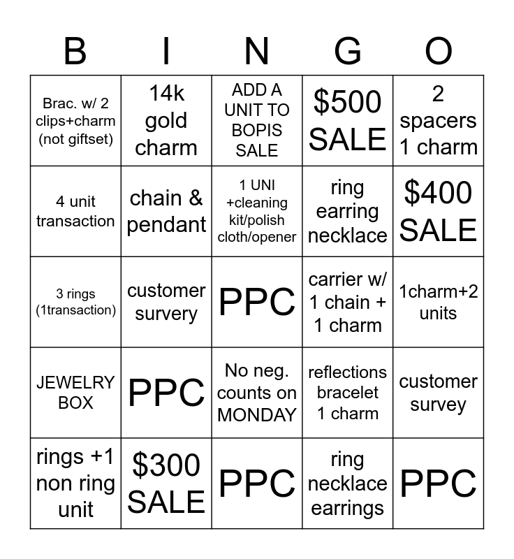 This bingo card has a free space and 24 words: PPC, $300 SALE, 1 UNI +cleaning kit/polish cloth/opener, rings +1 non ring unit, 2 spacers 1 charm, Brac. w/ 2 clips+charm (not giftset), 4 unit transaction, 14k gold charm, carrier w/ 1 chain + 1 charm, No neg. counts on MONDAY, ring earring necklace, 3 rings (1transaction), reflections bracelet 1 charm, customer survey, chain & pendant, ring necklace earrings, 1charm+2 units, ADD A UNIT TO BOPIS SALE, $400 SALE, customer survery, PPC, JEWELRY BOX, $500 SALE and PPC.