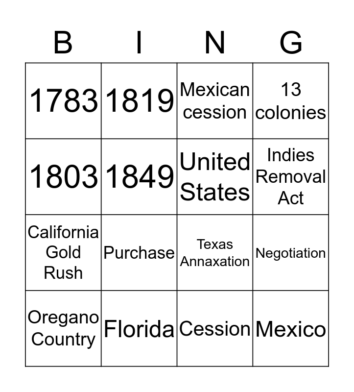 This bingo card has 16 words: Florida, Negotiation, Mexican cession, 1783, California Gold Rush, 1819, Texas Annaxation, Cession, 1803, 1849, Oregano Country, 13 colonies, Purchase, Indies Removal Act, United States and Mexico.