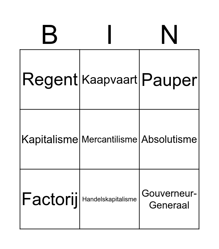 This bingo card has 19 words: Volkenrecht, Stapelmarkt, Pauper, Plantage, Gereformeerd, Mercantilisme, Multinational, Regent, Kaapvaart, Gouverneur-Generaal, Gewetensvrijheid, Absolutisme, Factorij, Constitutionele monarchie, Wetenschappelijke revolutie, Wereldeconomie, Kapitalisme, Handelskapitalisme and Gouden Eeuw.