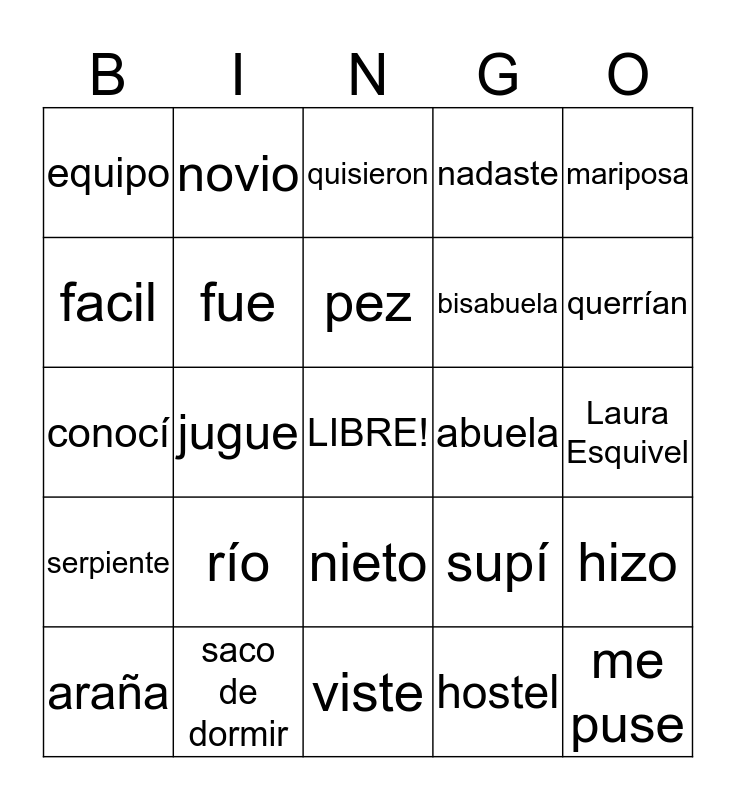 This bingo card has a free space and 24 words: río, saco de dormir, pez, araña, mariposa, equipo, facil, novio, abuela, nieto, bisabuela, conocí, supí, hizo, fue, hostel, Laura Esquivel, quisieron, querrían, jugue, me puse, serpiente, nadaste and viste.