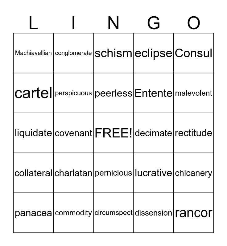 This bingo card has a free space and 24 words: charlatan, commodity, peerless, panacea, Consul, Machiavellian, cartel, conglomerate, decimate, pernicious, Entente, liquidate, lucrative, chicanery, perspicuous, dissension, rectitude, schism, malevolent, covenant, rancor, collateral, eclipse and circumspect.
