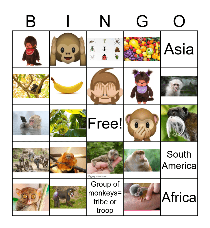 This bingo card has 20 images, a free space and 4 words: Asia, South America, Africa and Group of monkeys= tribe or troop.