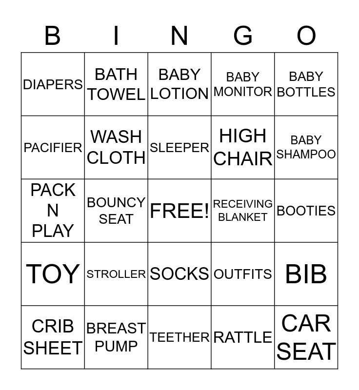 This bingo card has a free space and 24 words: STROLLER, BREAST PUMP, SLEEPER, CRIB SHEET, BABY BOTTLES, DIAPERS, PACIFIER, BATH TOWEL, RECEIVING BLANKET, SOCKS, HIGH CHAIR, PACK N PLAY, OUTFITS, BIB, WASH CLOTH, RATTLE, BOOTIES, BABY LOTION, BABY SHAMPOO, BOUNCY SEAT, CAR SEAT, TOY, BABY MONITOR and TEETHER.
