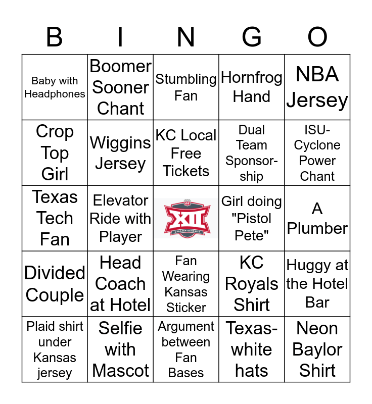 This bingo card has a free space and 29 words: Plaid shirt under Kansas jersey, Family K-State Chant Dance, Elevator Ride with Player, WVU Raccoon Hat, Baby with Headphones, Stumbling Fan, Wiggins Jersey, Head Coach at Hotel, Girl doing "Pistol Pete", Selfie with Mascot, A Plumber, Neon Baylor Shirt, Argument between Fan Bases, Texas- white hats, ISU- Cyclone Power Chant, WVU Sweatshirt over Jersey, Fan Wearing Kansas Sticker, Divided Couple, NBA Jersey, Texas Tech Fan, KC Royals Shirt, Irate ISU Fan, Dual Team Sponsor-ship, Crop Top Girl, Hornfrog Hand, Boomer Sooner Chant, Huggy at the Hotel Bar, KC Local Free Tickets and Workout Near Player.