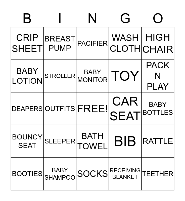 This bingo card has a free space and 24 words: SLEEPER, BABY SHAMPOO, BABY MONITOR, BOOTIES, HIGH CHAIR, CRIP SHEET, BABY LOTION, BREAST PUMP, CAR SEAT, BATH TOWEL, TOY, DEAPERS, BIB, RATTLE, STROLLER, RECEIVING BLANKET, BABY BOTTLES, PACIFIER, PACK N PLAY, OUTFITS, TEETHER, BOUNCY SEAT, WASH CLOTH and SOCKS.