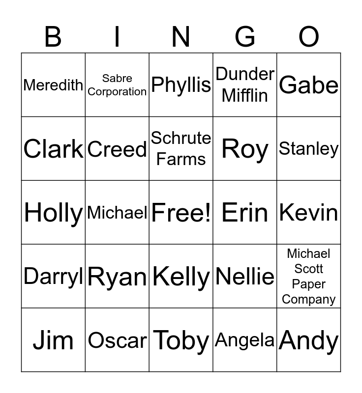 This bingo card has a free space and 29 words: Jim, Pam, Michael, Dwight, Meredith, Phyllis, Creed, Ryan, Erin, Oscar, Kevin, Andy, Toby, Angela, Stanley, Jan, Kelly, Darryl, Gabe, Holly, Nellie, Pete, Roy, Clark, Dunder Mifflin, Sabre Corporation, Michael Scott Paper Company, Schrute Farms and Vance Refrigeration.