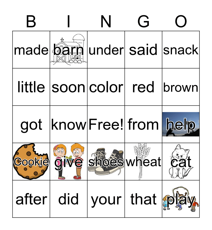 This bingo card has 11 images, a free space and 28 words: after, find, know, round, made, under, soon, give, from, did, help, play, your, that, brown, favorite, shoes, Cookie, snack, got, wheat, red, little, said, barn, cat, color and square.