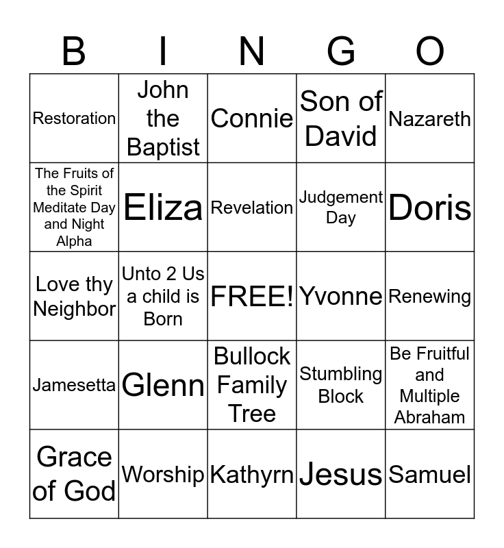 This bingo card has a free space and 26 words: Bullock Family Tree, Jesus, Revelation, Worship, Nazareth, Restoration, The Fruits of the Spirit Meditate Day and Night Alpha, John the Baptist, Renewing, Stumbling Block, Judgement Day, Love thy Neighbor, Be Fruitful and Multiple Abraham, Grace of God, Unto 2 Us a child is Born, Remission of Sins, Son of David, Jamesetta, Connie, Samuel, Doris, Kathyrn, Yvonne, Glenn, Eliza and Nellie.