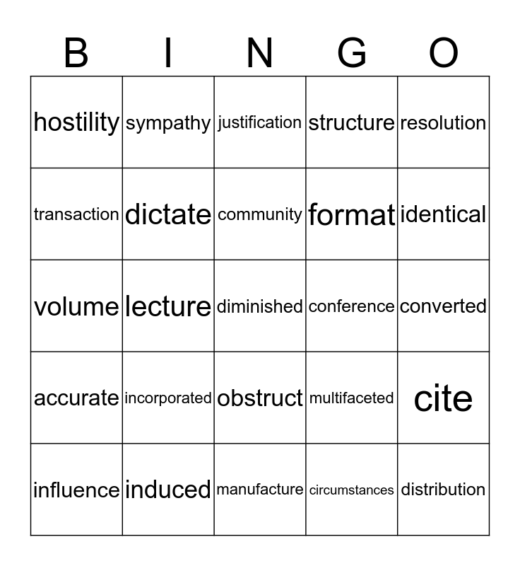 This bingo card has 73 words: Unique, jibe, hostility, pall, credibility, advocate, accurate, Obvious, multifaceted, subordinate, distribution, persistent, dictate, converted, revision, sympathy, manufacture, transaction, promotion, conference, community, structure, resolution, respond, influence, investigation, transformation, intervention, assume, levy, induced, exhibit, inferred, incident, lecture, relevant, substitution, conversely, diminished, estate, circumstances, incorporated, assurance, inclination, allocation, format, justification, intermission, instance, volume, security, convention, assessment, amateur, document, assistance, civil, obstruct, voluntary, dynamic, survive, clarity, context, identical, infinite, sponsor, financial, identified, cite, diversity, edition, eventually and infrastructure.