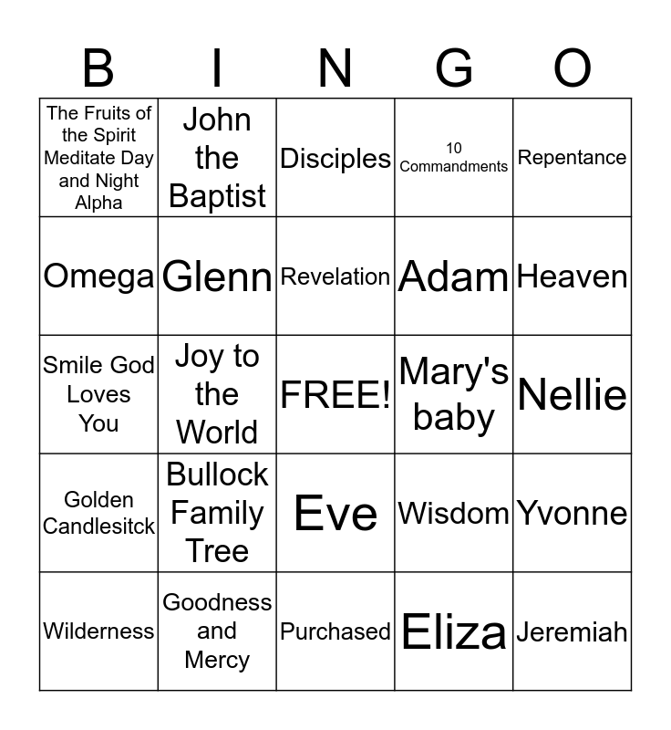 This bingo card has a free space and 24 words: Bullock Family Tree, Goodness and Mercy, Revelation, Wilderness, Repentance, The Fruits of the Spirit Meditate Day and Night Alpha, Omega, John the Baptist, Mary's baby, Eve, Adam, Smile God Loves You, Wisdom, Yvonne, Glenn, Eliza, Nellie, Disciples, Heaven, Joy to the World, Jeremiah, Golden Candlesitck, 10 Commandments and Purchased.