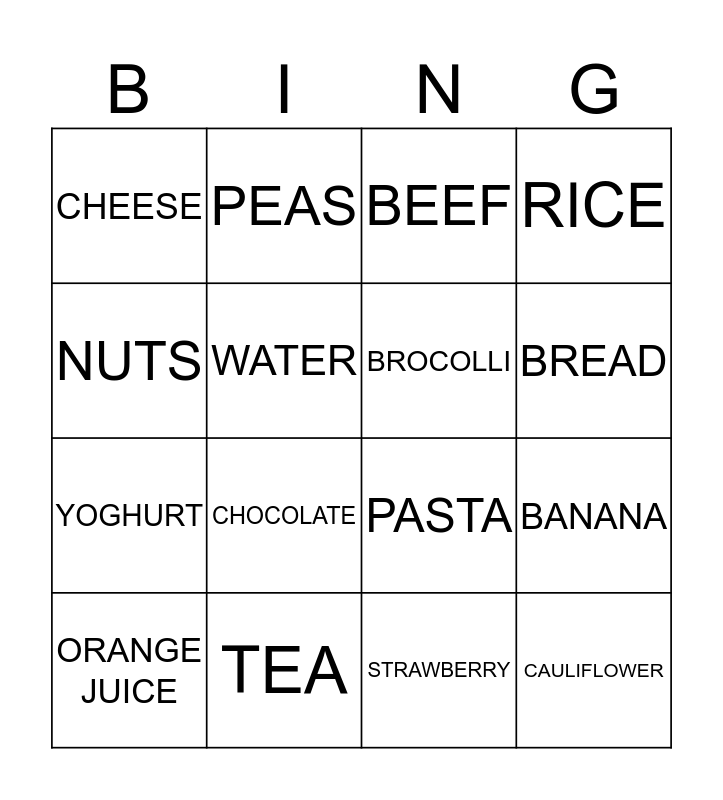 This bingo card has 28 words: CARROT, CHICKEN, YOGHURT, MILK, WATER, BEEF, PEAS, CAULIFLOWER, TEA, LENTILS, PASTA, RICE, CAKE, TOFU, CHOCOLATE, COFFEE, LAMB, BROCOLLI, BREAD, EGGS, CHEESE, RAISINS, ORANGE JUICE, BANANA, STRAWBERRY, SOYA MILK, NUTS and SALMON.