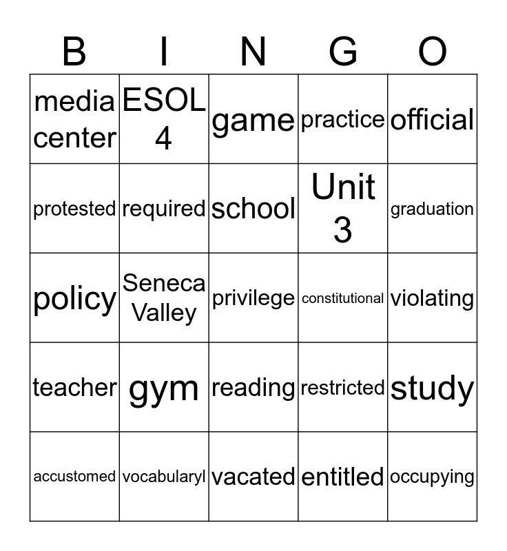 This bingo card has 29 words: accustomed, offense, privilege, entitled, official, protested, ESOL 4, vacated, constitutional, occupying, policy, required, Free!, restricted, violating, test, Seneca Valley, reading, practice, study, teacher, vocabularyl, school, Unit 3, graduation, media center, gym, game and fun.