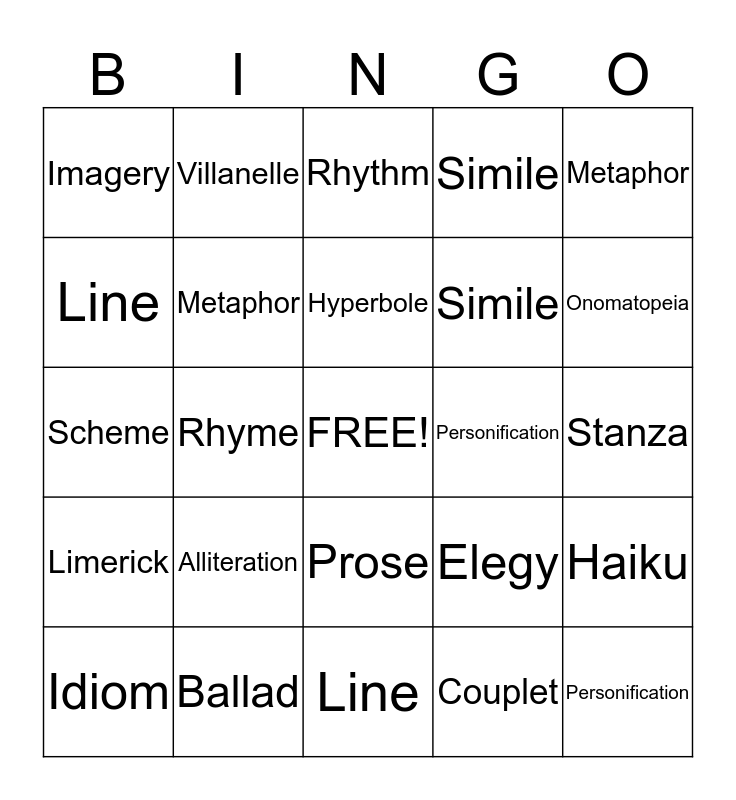 This bingo card has a free space and 24 words: Alliteration, Ballad, Hyperbole, Idiom, Metaphor, Imagery, Line, Villanelle, Personification, Prose, Simile, Scheme, Elegy, Haiku, Metaphor, Couplet, Stanza, Rhythm, Onomatopeia, Rhyme, Personification, Limerick, Simile and Line.