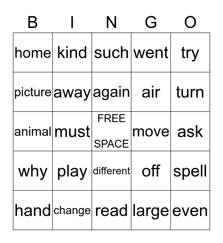 This bingo card has a free space and 24 words: play, change, again, hand, try, home, picture, kind, move, different, air, animal, off, spell, away, large, ask, such, turn, must, even, why, went and read.