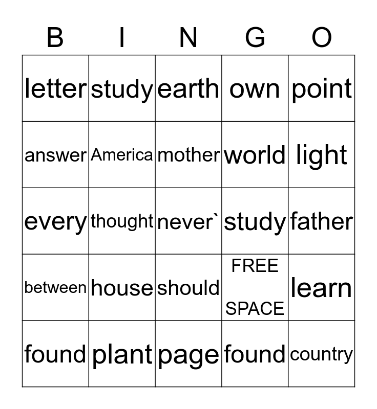 This bingo card has 25 words: house, page, mother, found, point, letter, answer, study, study, should, world, every, FREE SPACE, learn, America, country, father, earth, light, thought, never`, plant, between, own and found.