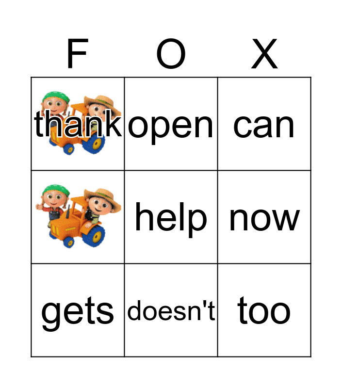 This bingo card has 2 images, a free space and 10 words: stands, doesn't, too, gets, open, can, now, needs, thank and under.