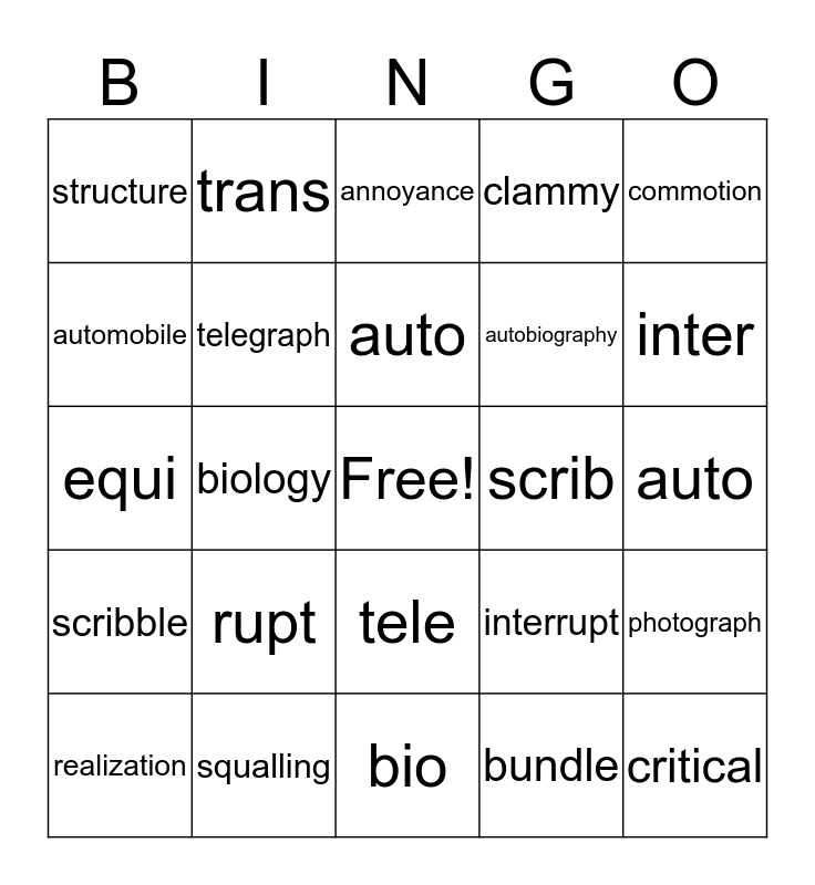This bingo card has a free space and 44 words: photo, critical, secured, realization, demolished, bundle, annoyance, elite, commotion, squalling, clammy, scrib, tele, rupt, anti, bio, con, equi, struct, inter, trans, aqua, erupt, structure, antisocial, auto, telegraph, intersection, interrupt, scribble, telescope, photograph, describe, ruptured, biology, equation, transcontinental, aquarium, auto, automobile, autobiography, construction, telegraph and disrupt.